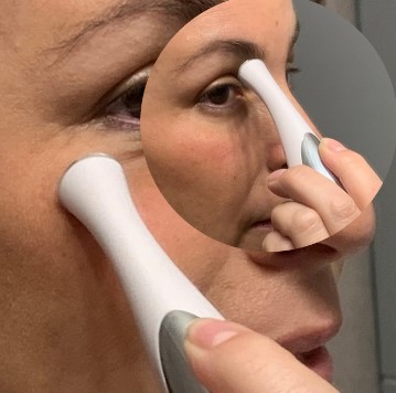 - Aplicar una pequeña cantidad de gel, crema, serum o gel cream para párpados Idraet , Lidherma , Exel , Laca y proceder a realizar masajes en la zona con el dispositivo. Trabajar suavemente con movimientos circulares sobre líneas de expresión, ojeras y bolsas. El extremo metálico y la forma redondeada del cabezal permitirán un muy buen masaje y la descongestión de la zona ocular.